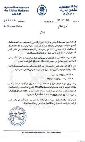 أعلنت الوكالة الموريتانية للشؤون البحرية عن توفر 70 فرصة عمل لصالح البحارة الموريتانيين، وذلك على خلفية النقص المسجل في اليد العاملة البحرية لدى السفن الوطنية العاملة بميناء تانيت. ويأتي هذا الإعلان عقب اجتماع احتضنته مدينة نواذيبو يوم 31 يناير 2026 بإشراف الوكالة، وبمشاركة ملاك السفن وممثلين عن النقابات المهنية للبحارة، حيث تم خلاله استعراض وضعية اليد العاملة في القطاع وسبل سد العجز المسجل في بعض التخصصات البحرية.
